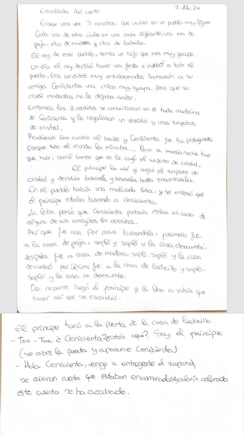 Para la segunda actividad, hicimos una ``ensalada´´, es decir, mezclar dos o más historias. En esta ocasión, hicimos una fusión con dos cuentos tradicionales, Cenicienta y los tres cerditos.